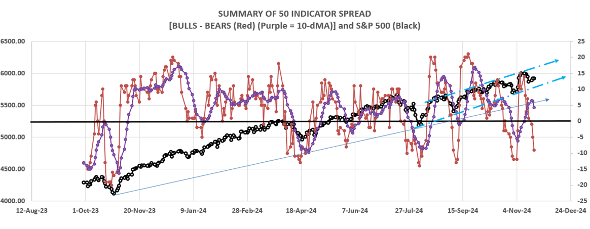 The daily Bull/Bear, 50-Indicator spread (Bull Indicators