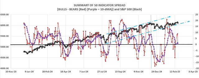 The daily, bull-bear spread of 50-indicators improved to a Neutral -4 (4 more Bear indicators than Bull indicators). The 10-dMA of the spread continued falling, a bearish sign.
